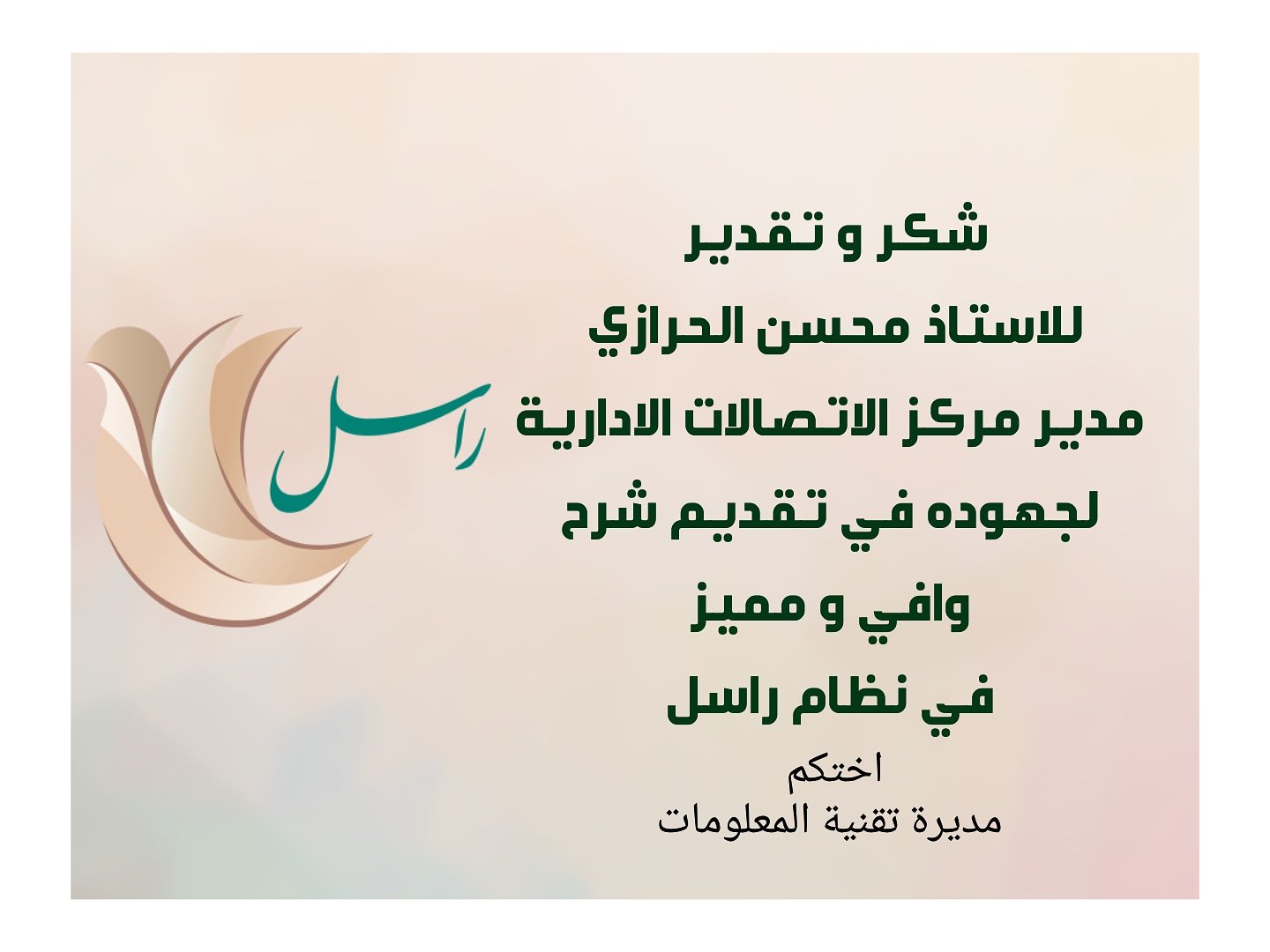 شرح نظام راسل. دعم وصيانة أجهزة الحاسب. بدأ العمل باستخدام الحاسب الآلي منذ عام 1419 هـ من خلال نظام الاتصالات الإدارية و امتدادا لتوجيهات وزير التعليم العالي حفظه الله حرص المركز على تطبيق جميع التقنيات المتطورة المتاحة حتى يكون مركز الاتصالات الإدارية في وزارة التعليم العالي من رواد مراكز الاتصالات في. كل مايتعلق ببرنامج راسل شرح وتعريف دليل نظام المراسلات التعميم اسم العضو حفظ البيانات. أتمته إجراءات العمل الخاصة بالوارد العام والصادر الخارجي والصادر الداخلي في جميع قطاعات الوزارة وإدارات التعليم والملحقيات.